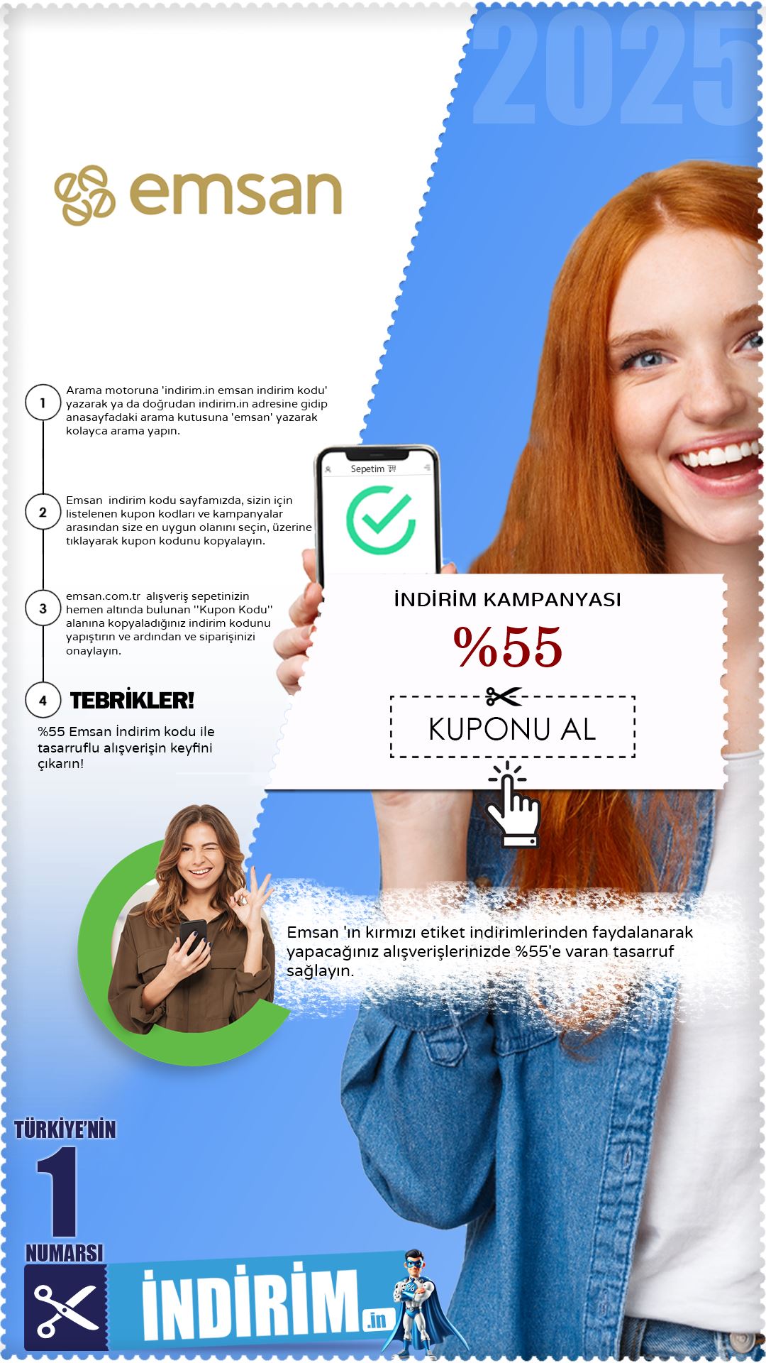 - %50%50 Emsan İndirim Kampanyası Emsan'da seçili ürünlerde sepette %50 indirimli alışveriş fırsatını kaçırmayın.